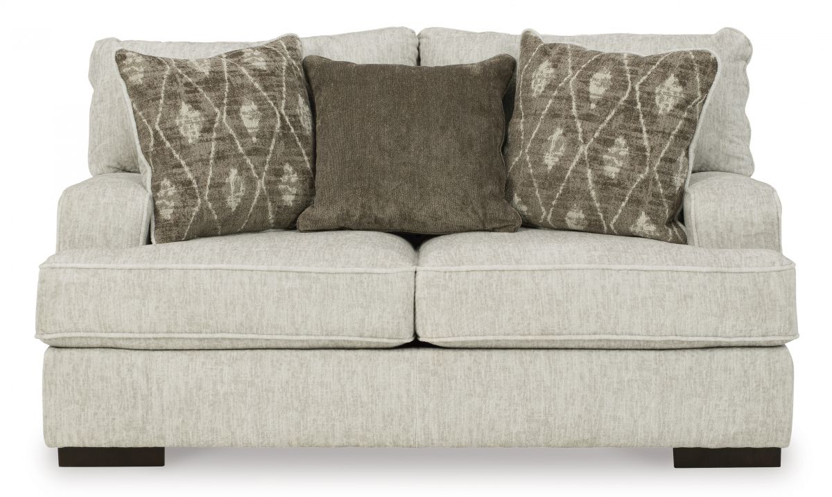 Decidedly modern with a sense of relaxed ease, the Alesandra loveseat looks at home in so many different places and spaces. Providing a highly distinctive look: substantial track arms with curved cornering, wrapped t-cushions and low-to-the-floor block feet in a warm wood-tone finish. Sporting a subtle chevron texture, the parchment-tone upholstery takes neutral to new heights.