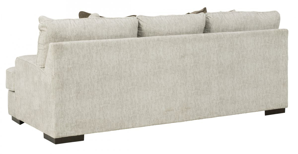 Decidedly modern with a sense of relaxed ease, the Alesandra sofa looks at home in so many different places and spaces. Providing a highly distinctive look: substantial track arms with curved cornering, wrapped t-cushions and low-to-the-floor block feet in a warm wood-tone finish. Sporting a subtle chevron texture, the parchment-tone upholstery takes neutral to new heights.