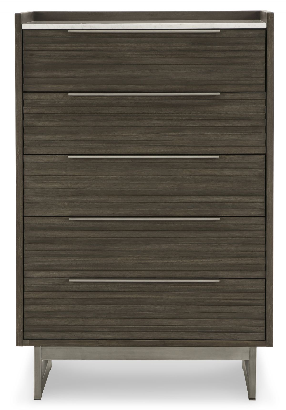 Clean lines lend sophistication and structure to the Arkenton chest of drawers. Its complex rich grayish brown finish contrasts perfectly with a white marble top, while the streamlined silhouette features overlay slats to create visual interest. A metal base and bar pulls in a low-sheen steel finish add to this piece's contemporary vibe.