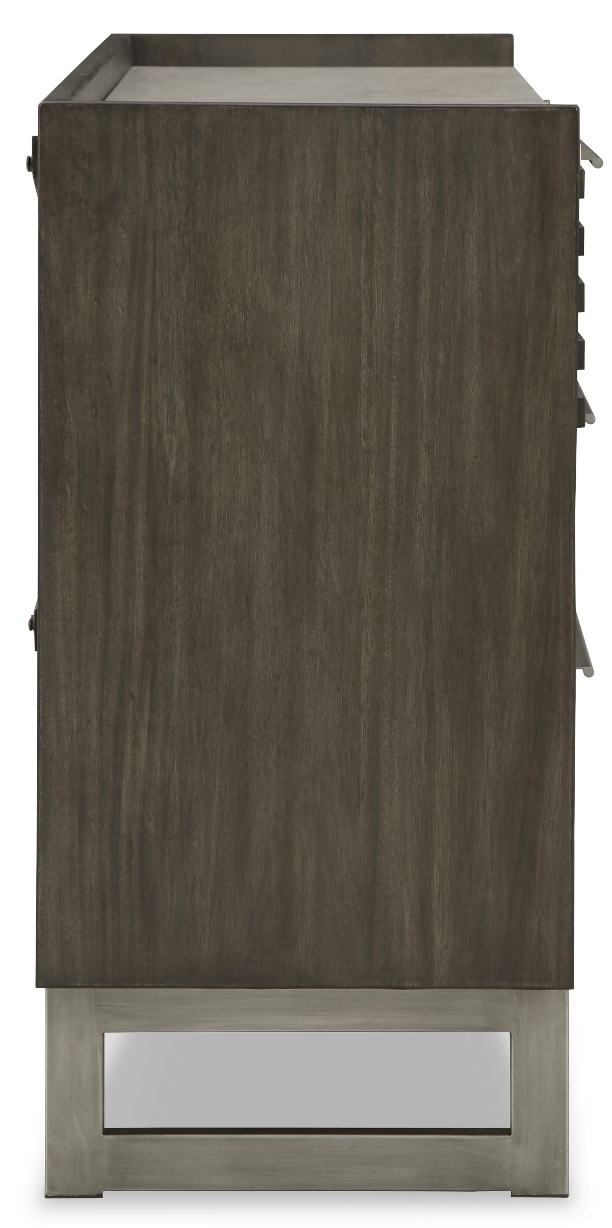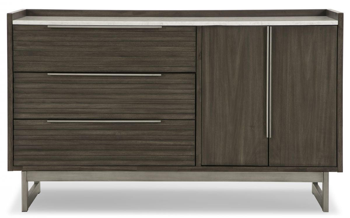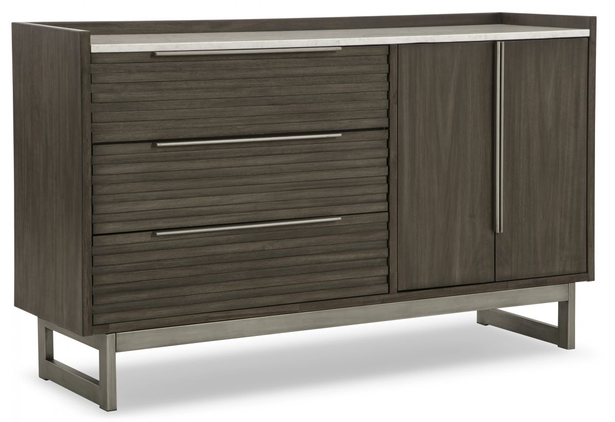 Clean lines lend sophistication and structure to the Arkenton dresser. Its complex rich grayish brown finish contrasts perfectly with a white marble top, while the streamlined silhouette features overlay slats to create visual interest. A metal base and bar pulls in a low-sheen steel finish add to this piece's contemporary vibe.