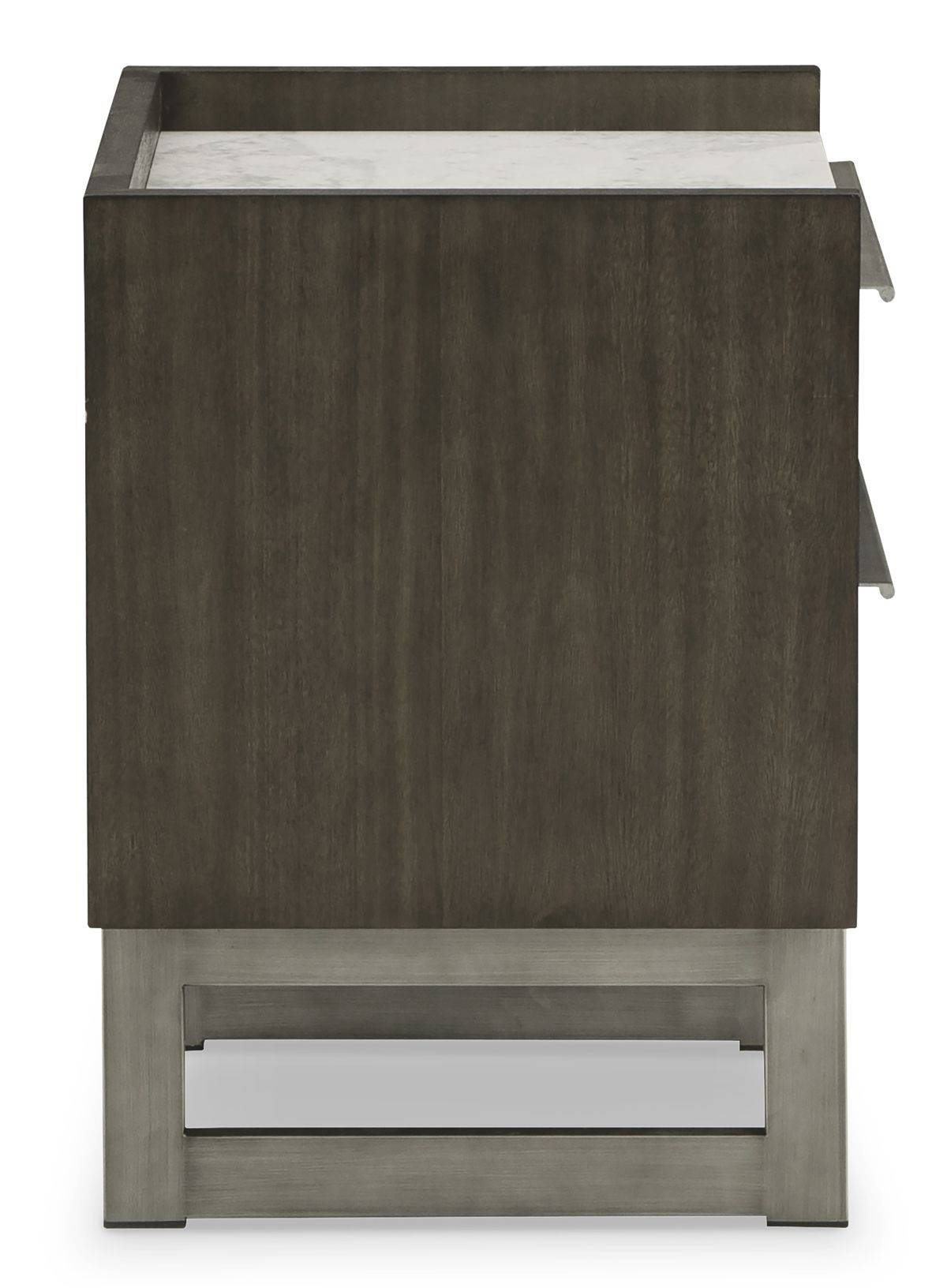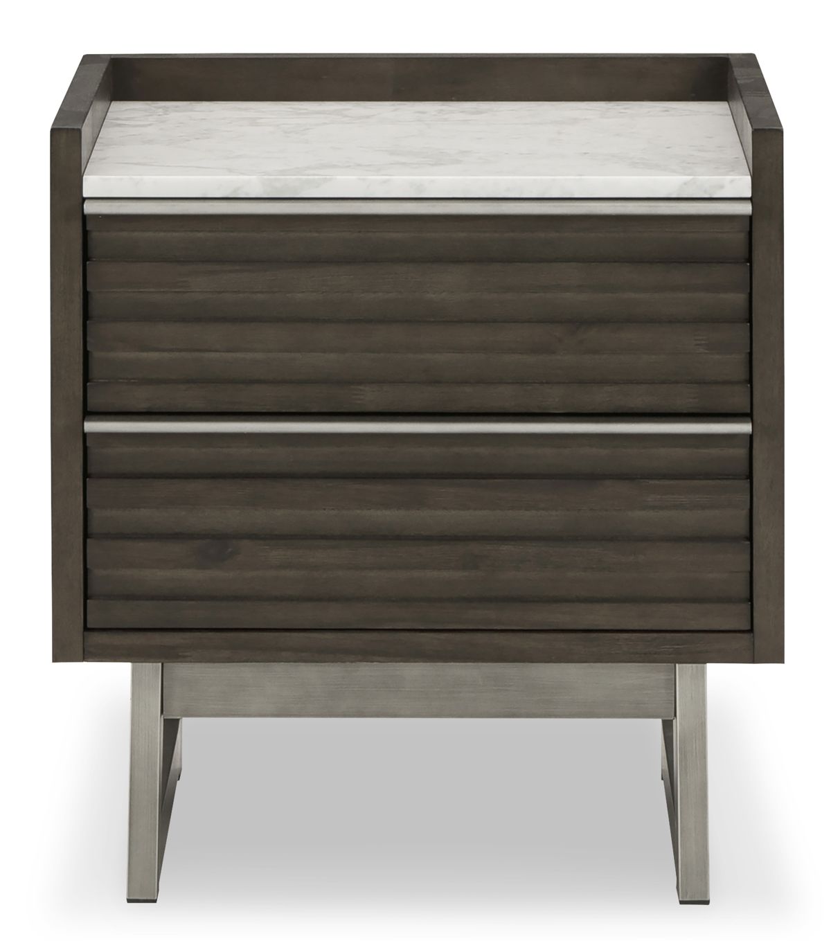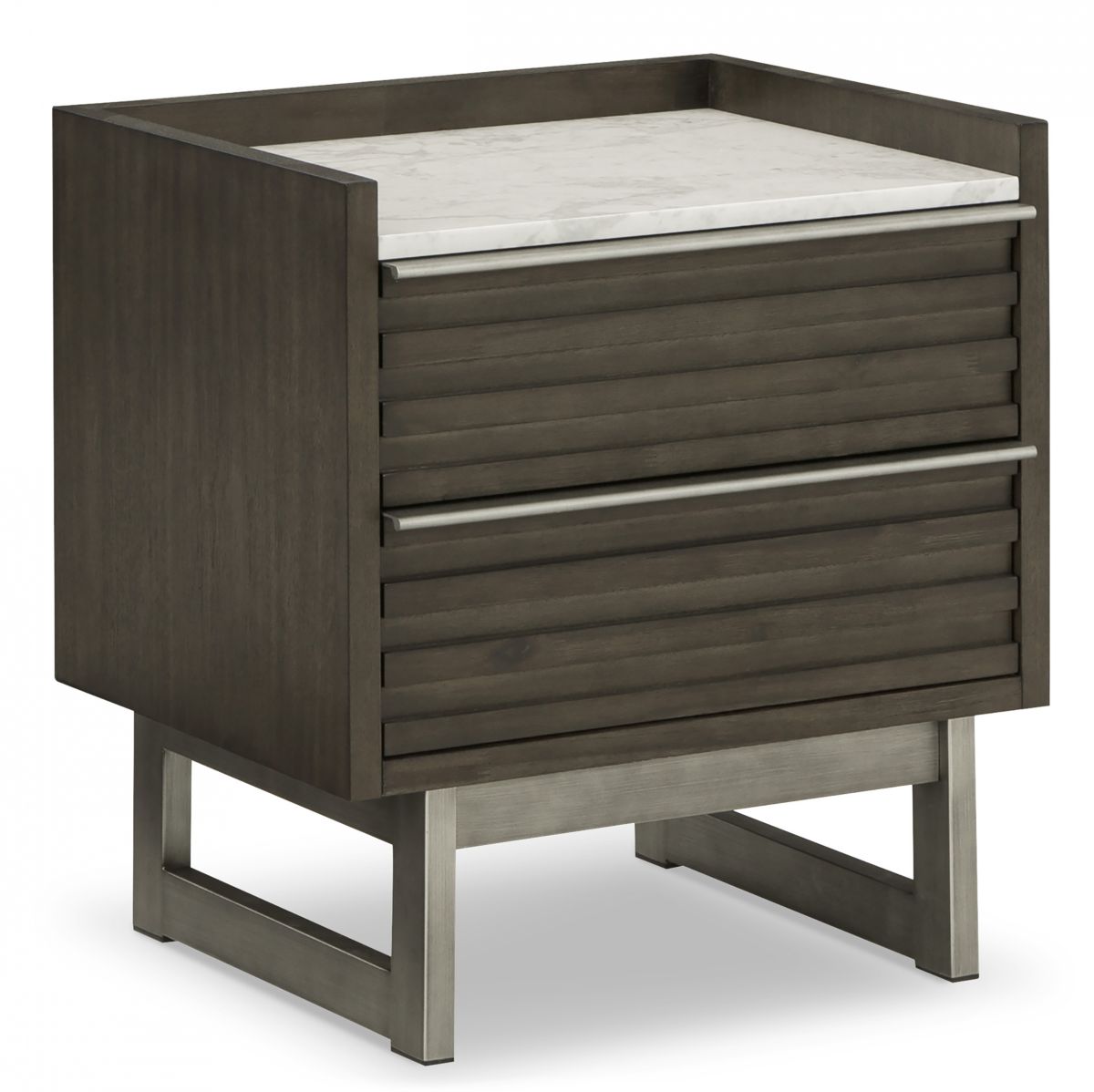 Clean lines lend sophistication and structure to the Arkenton nightstand. Its complex rich grayish brown finish contrasts perfectly with a white marble top, while the streamlined silhouette features overlay slats to create visual interest. A metal base and bar pulls in a low-sheen steel finish add to this piece's contemporary vibe.