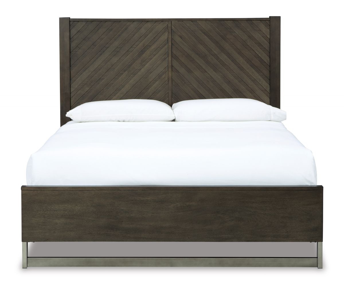 Clean lines lend sophistication and structure to the Arkenton queen panel bed. Its complex rich grayish brown finish, slats set in a contemporary herringbone pattern, and low-profile footboard create visual interest and add to this bed's contemporary vibe. In addition, dual USB charging ports are conveniently built into each side of the headboard—what a plus for keeping your electronic devices charged and at your fingertips.