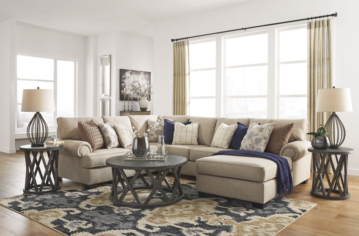 Lighten things up in a comfortably chic way with the Baceno 3-piece sectional in “hemp” beige. Traditional elements such as t-cushion styling and prominent piping are modified with slanted roll arms for a beautiful balance of classic and contemporary. Linen-weave textural fabric is paired with posh designer pillows that truly perfect the look.