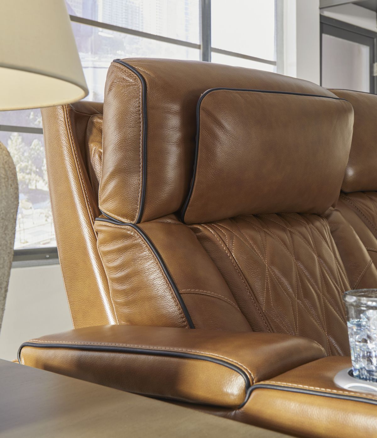 This power-reclining sofa has high-tech style with down-home comfort thanks to the brown leather upholstery.