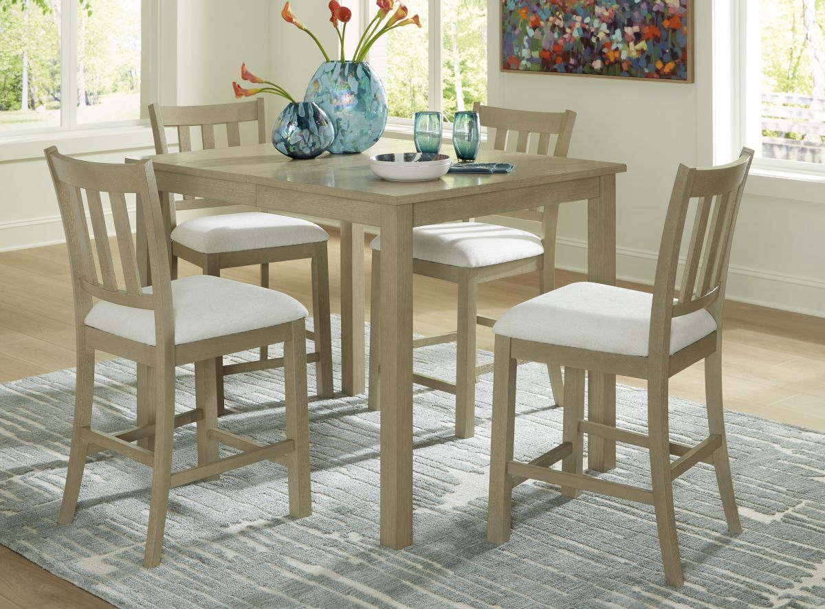 Satisfy your taste for casually cool simplicity with this upholstered counter height bar stool. More than easy on the eyes, its gray wash finish with warm undertones is highlighted with a white glaze to enhance the wood grain texture. The casual slat back design and nicely neutral woven fabric exude a relaxed aesthetic as you gather round the table.