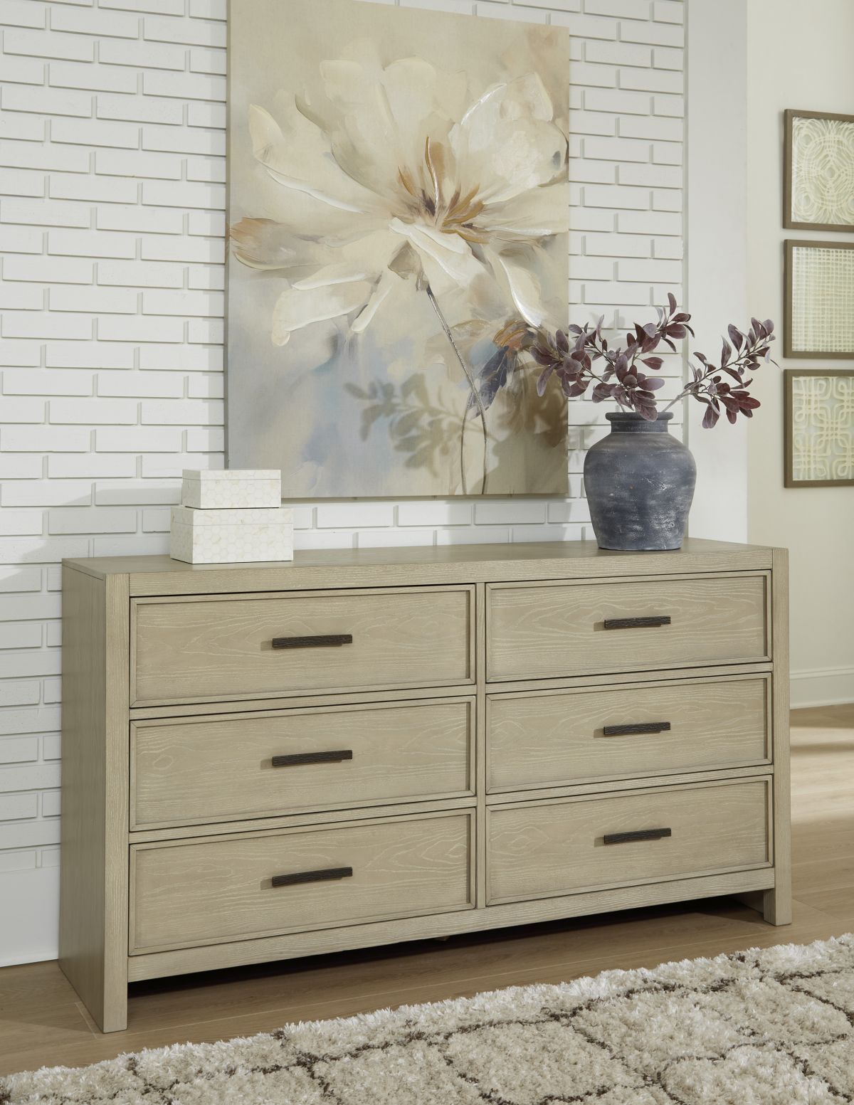 Satisfy your taste for calming, casually cool simplicity with this dresser. More than easy on the eyes, its gray wash finish with warm undertones is highlighted with a white glaze to enhance the wood grain texture. Smooth-gliding storage drawers are accented with stylish metal bar pulls in a contrasting blackened steel finish. It's time to create the understated, relaxed look you want to wake up to every morning.