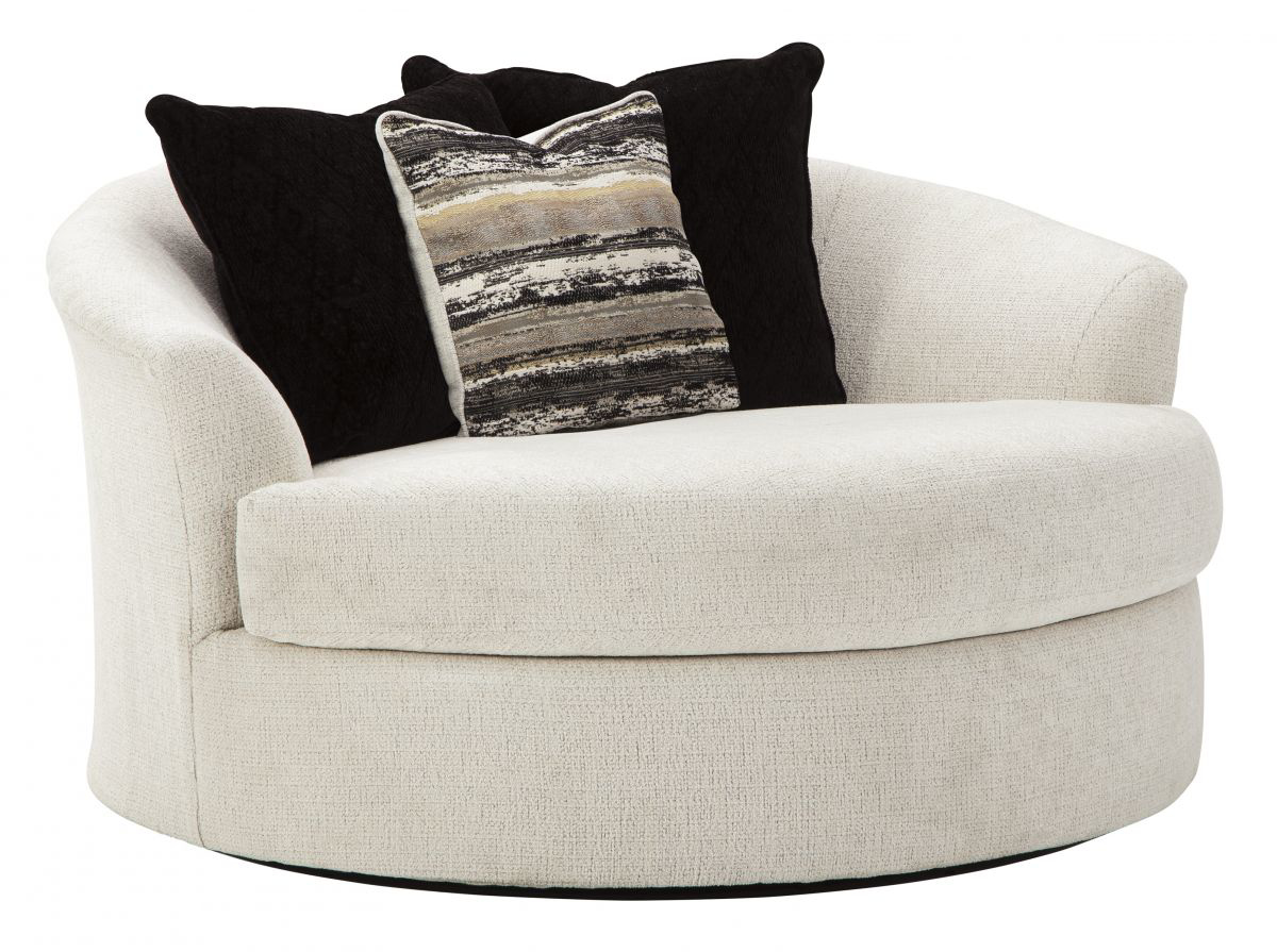 Let it snow. Doubling your pleasure with a spacious seating area with room for two—or just you—the Cambri oversized round swivel chair in a snow-tone neutral invites you to stretch your style in an easy-elegant way. Whether your aesthetic is urban hip or suburban chic, this posh swivel chair is sure to look and feel right at home. Wrapped in a chunky heavyweight chenille fabric with a delightful touch, this fashion-forward chair includes designer pillows for a brilliant pop of color and texture.