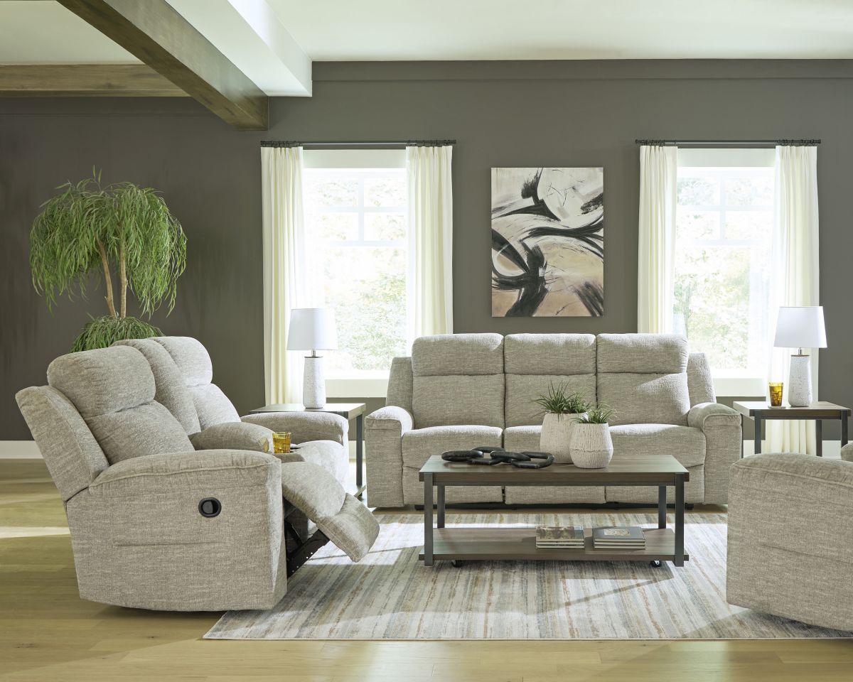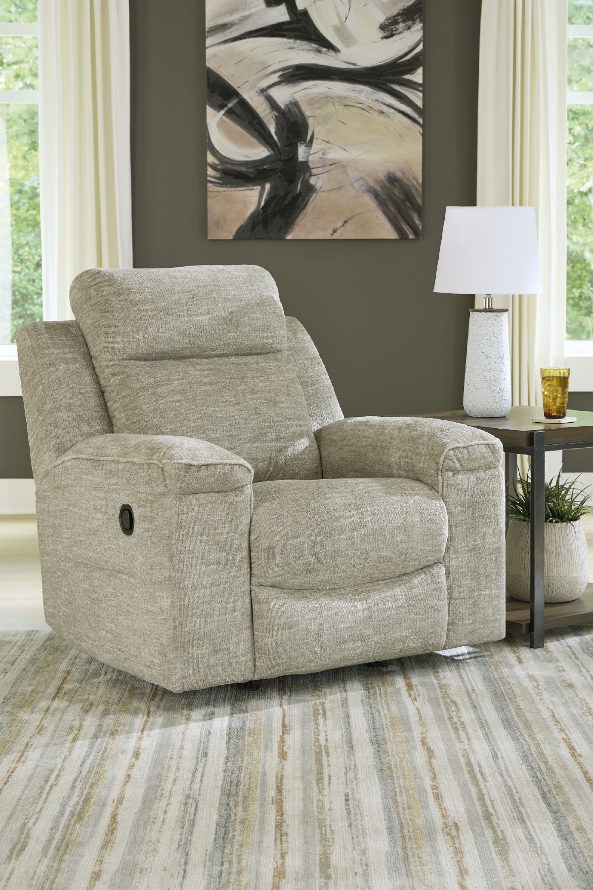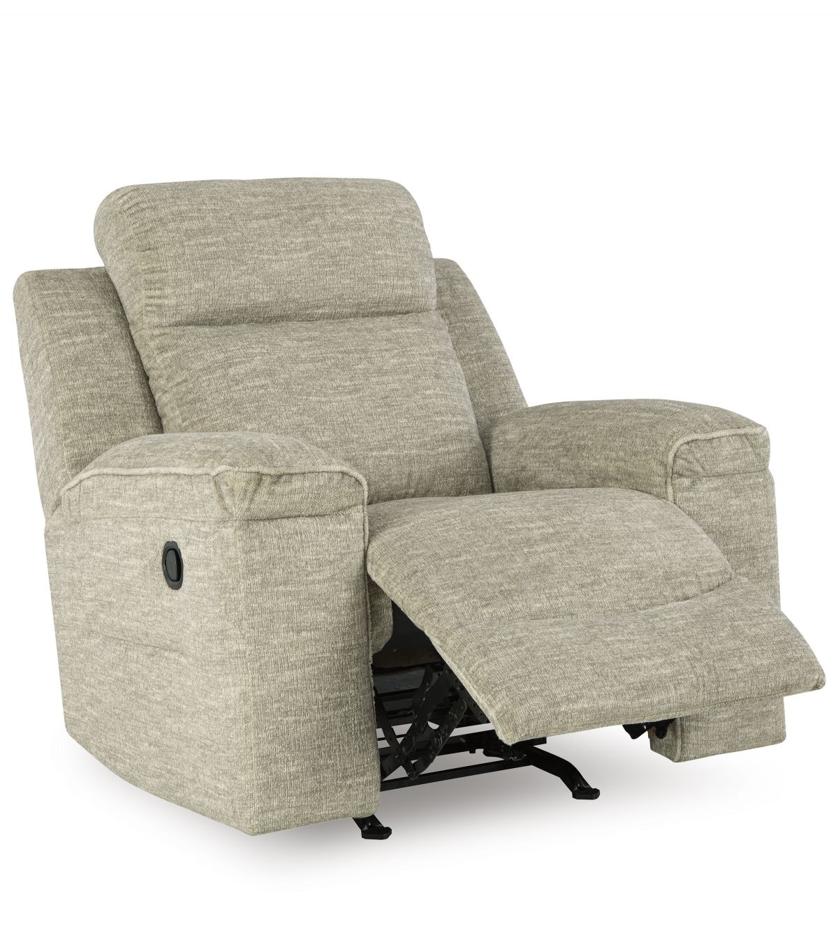 Cozy up in contemporary style. With super-plush fabric and padded arms, this rocker recliner levels up your day-to-day lounging. Sit back and relax with a simple pull tab motion. Thanks to this recliner's inviting neutral hue, you have the flexibility to pair it with a variety of styles and colors. Comfort has never looked so chic.