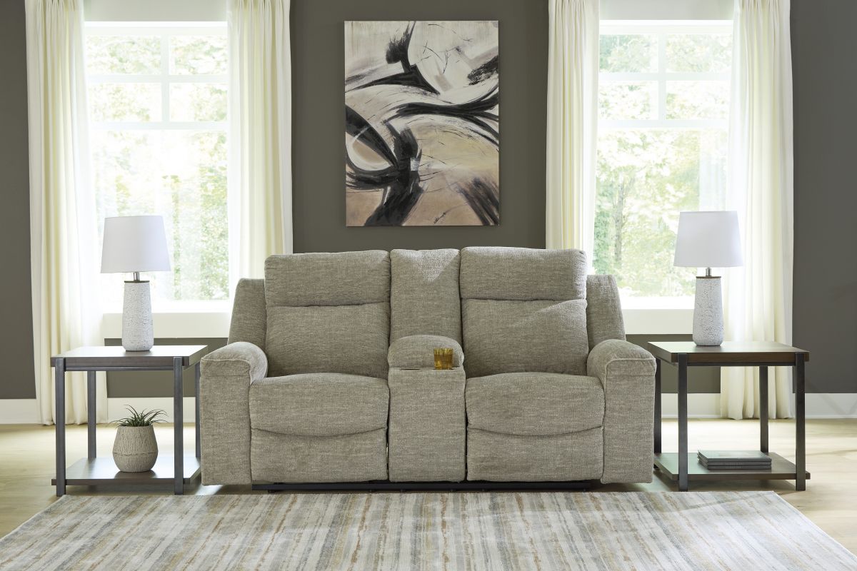 Cozy up in contemporary style. With super-plush fabric and padded arms, this reclining loveseat with console levels up your day-to-day lounging. Sit back and relax with a simple pull tab motion. Thanks to this loveseat's inviting neutral hue, you have the flexibility to pair it with a variety of styles and colors. Comfort has never looked so chic.