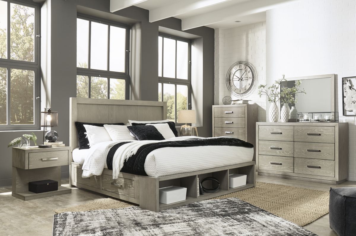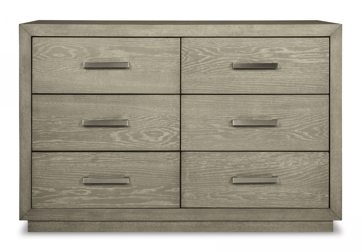 The Fawnburg dresser has a clean, contemporary design with a relaxed sensibility. Its sturdy silhouette sports a trend-right gray taupe finish. The streamlined design includes six self-closing drawers with fully finished boxes. Classically luxe metal bar pulls with an aged pewter-tone finish complete the look.
