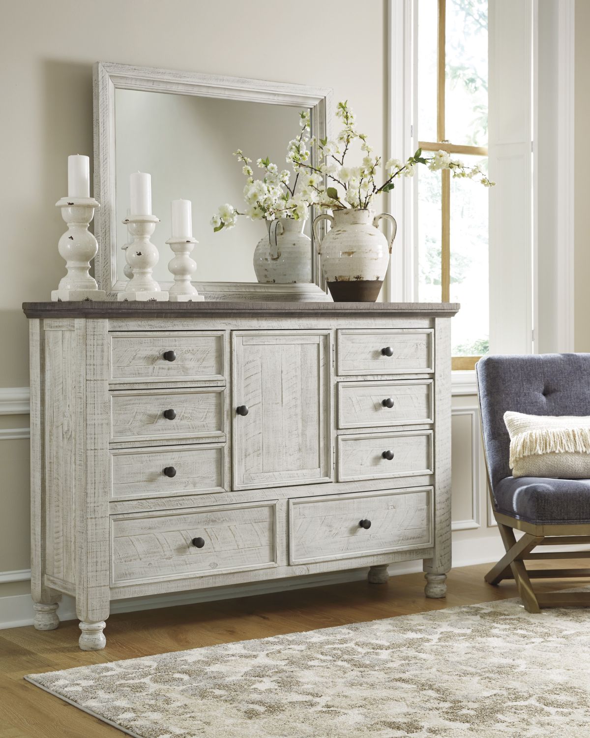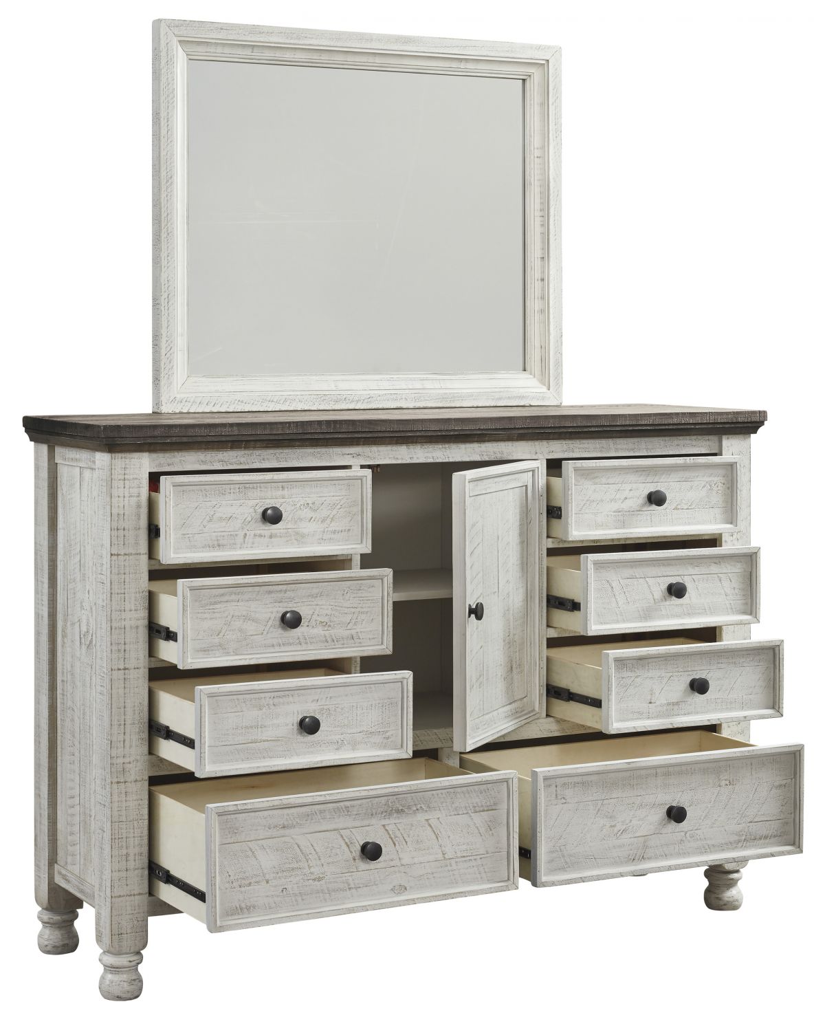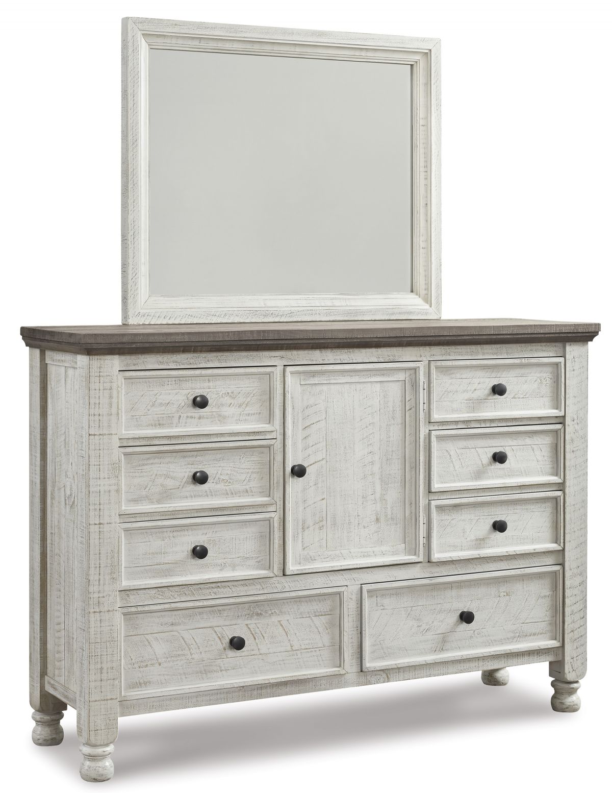 What a fresh interpretation of country classic style. Inspired by American farmhouse craftsmanship, but with an elevated sensibility, the Havalance dresser and mirror set blends distinctive details such as turned post accents and raised drawer fronts for a substantial look that feels right at home. Those who appreciate rustic character should take note of this dresser’s thick profile crown mouldings, beautified with a vintage two-tone finish.