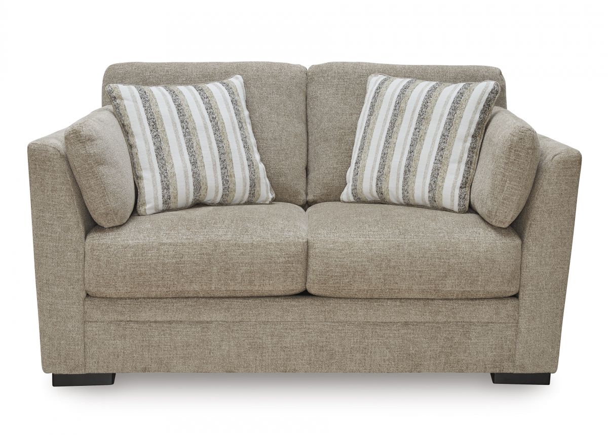 Looking for the perfect blend of decadent luxury and contemporary flair? You've gotta check out this loveseat. With its plump cushions, plush chenille fabric and softly tapered arms, this piece makes it easy to lounge solo or with a friend in stunning style. Arm bolster pillows and striped accent pillows are icing on the comfort cake.
