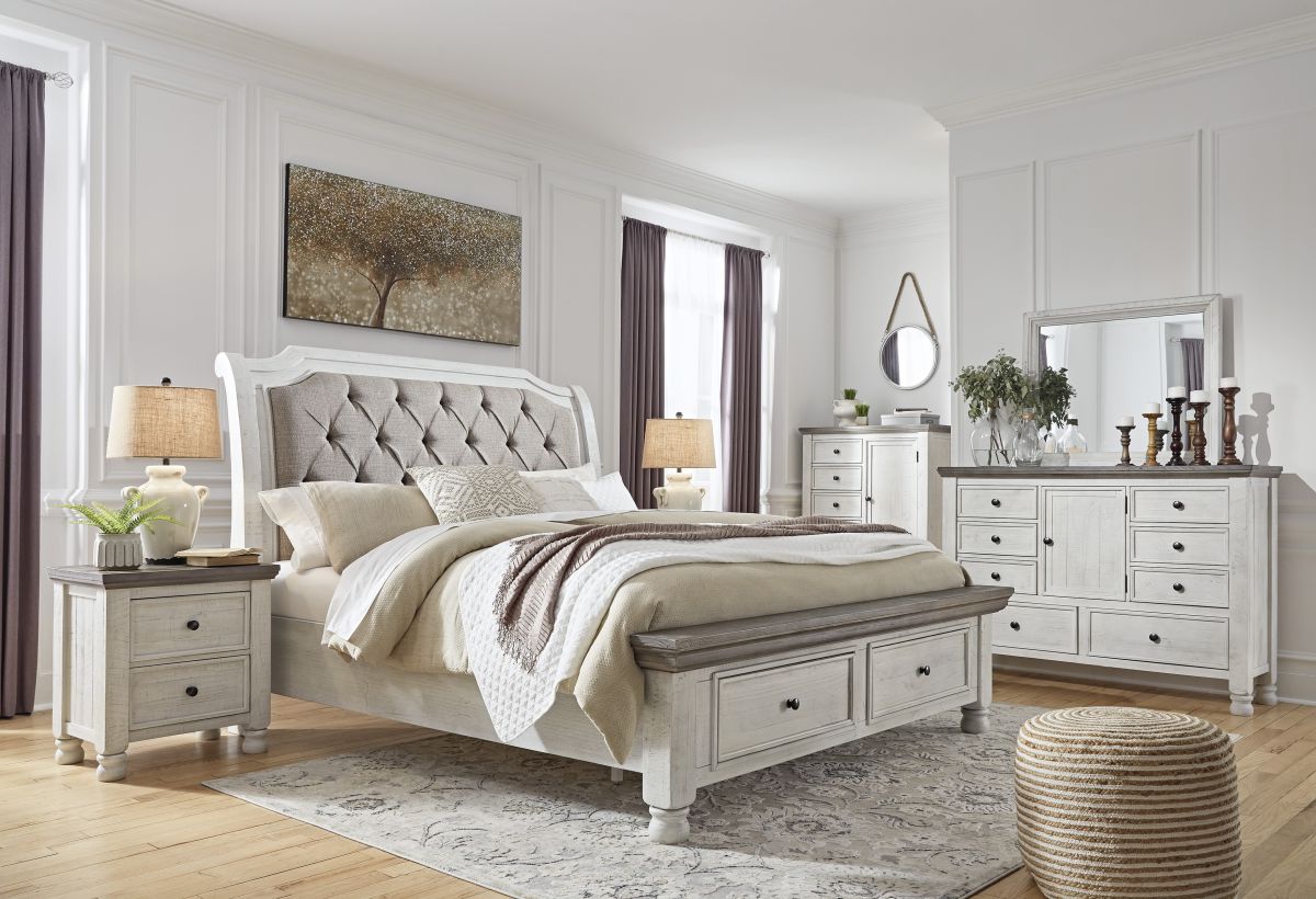 What a fresh interpretation of country classic style. Inspired by American farmhouse craftsmanship, but with an elevated sensibility, the Havalance king sleigh bed with storage blends distinctive details—such as turned post accents, a tufted cushioned headboard and raised drawer fronts—for a substantial look that feels right at home. Those who appreciate rustic character should take note of the bed’s thick-profile crown moulding, beautified with a vintage two-tone finish. Two handy storage drawers flawlessly integrate traditional style with modern convenience.
