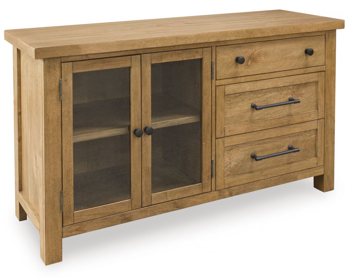 Add exceptional modern farmhouse appeal to your eating and gathering space with this dining server. A light wood-tone finish enhances the rich natural beauty. Interior shelving and spacious drawers conveniently store dining and other accessories. With charming simplicity and a sturdy silhouette, this versatile server offers a casually delicious design that’s right at home as a TV stand or entryway table.