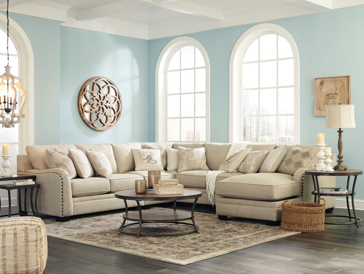 Alluring and inviting, the Luxora sectional delivers a combination of traditional style and modern comfort. Upholstered in a soothing bisque-colored fabric, this seating arrangement includes UltraPlush cushions and back pillows for added indulgence. Nailhead trim punctuating the sides of the sectional draws attention to the arms' gracious curves. Six designer pillows in muted neutral hues and contrasting patterns add warmth and texture.