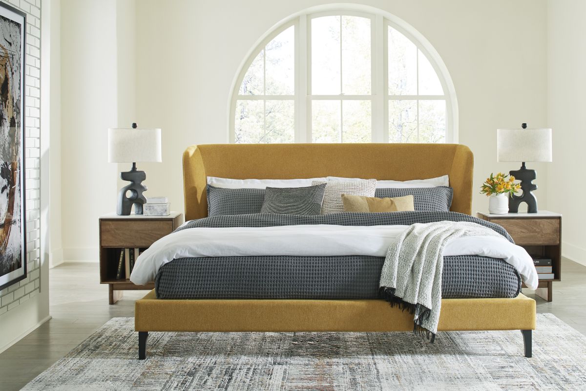 Maloken King Upholstered Bed with Roll Slats, Mustard, large