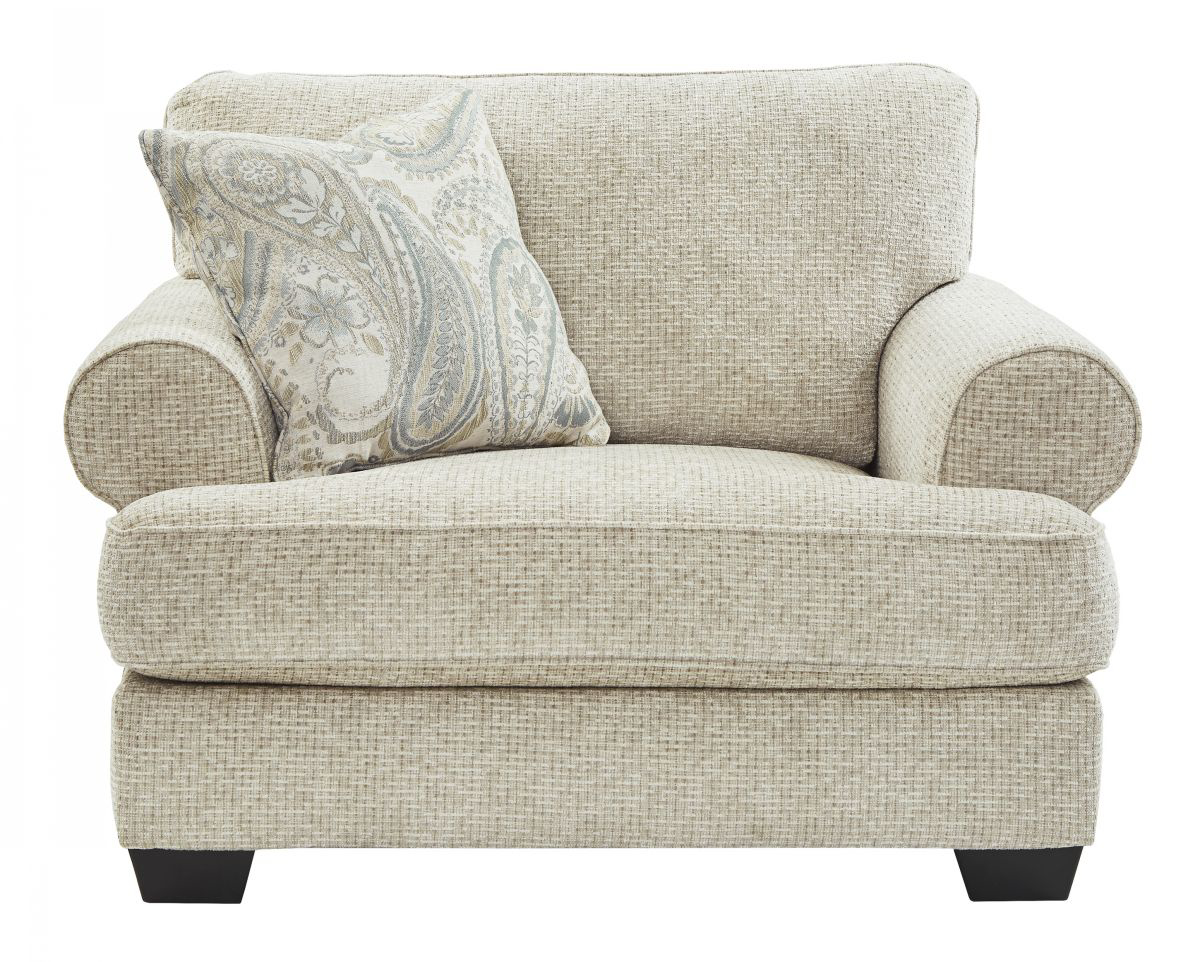 The Monaghan oversized chair strikes a beautiful balance between classic and current. Traditional elements include t-cushion seating and setback roll arms, angled for modern flair. Jacquard paisley pillow makes a muted, mellow complement to the chair’s casual textured chenille upholstery. Choice of sandstone beige is a light and lovely style awakening.