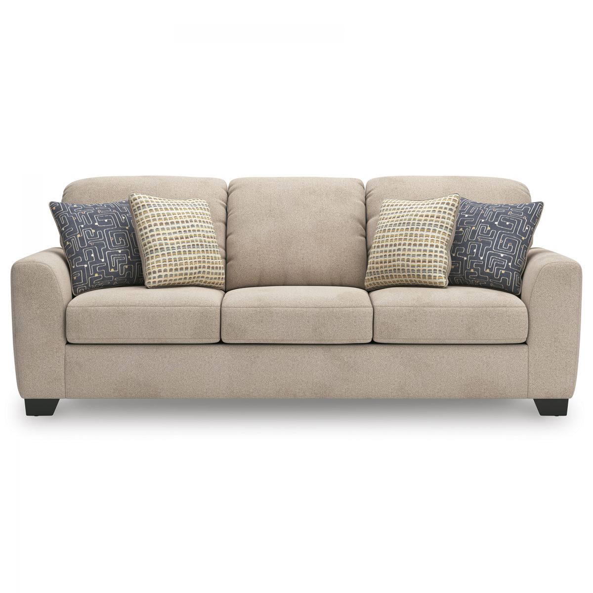 Need a piece to perfectly anchor your home's casual contemporary aesthetic? The pinnacle of chic comfort, this sofa has a universal appeal thanks to plush chenille upholstery in a neutral hue. Its simple, streamlined design, with wide party arms, is sure to appeal to your relaxed approach to modern flair. Boldly patterned accent pillows complete the look. All that's left for you to do is sprawl out solo or with friends and revel in the feeling of style made simple.