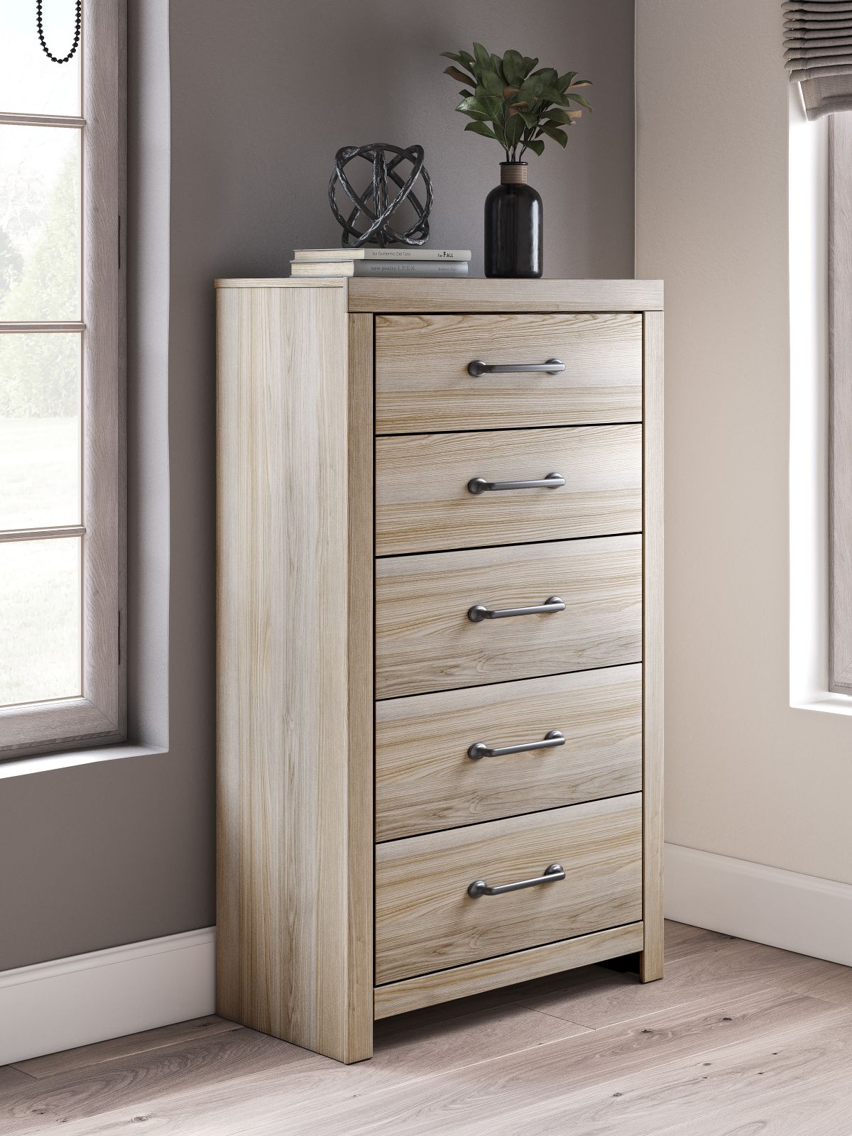 Experience restfulness with the Senbry chest of drawers, made with a light wood finish and pewter-tone hardware.