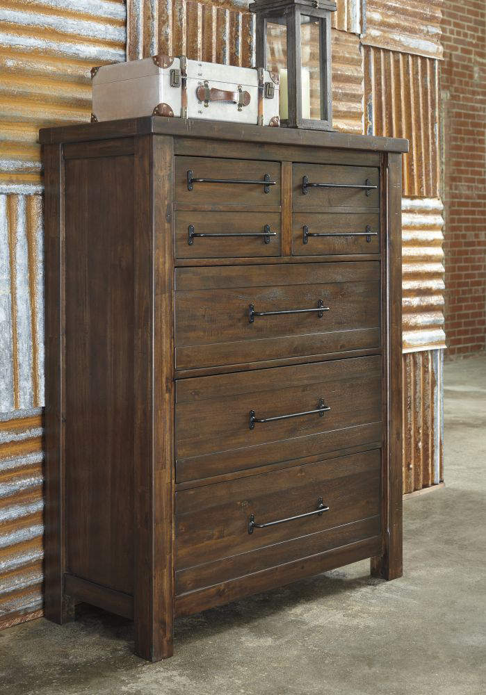 Experience urban industrial charm with the Starmore chest with a walnut finish.