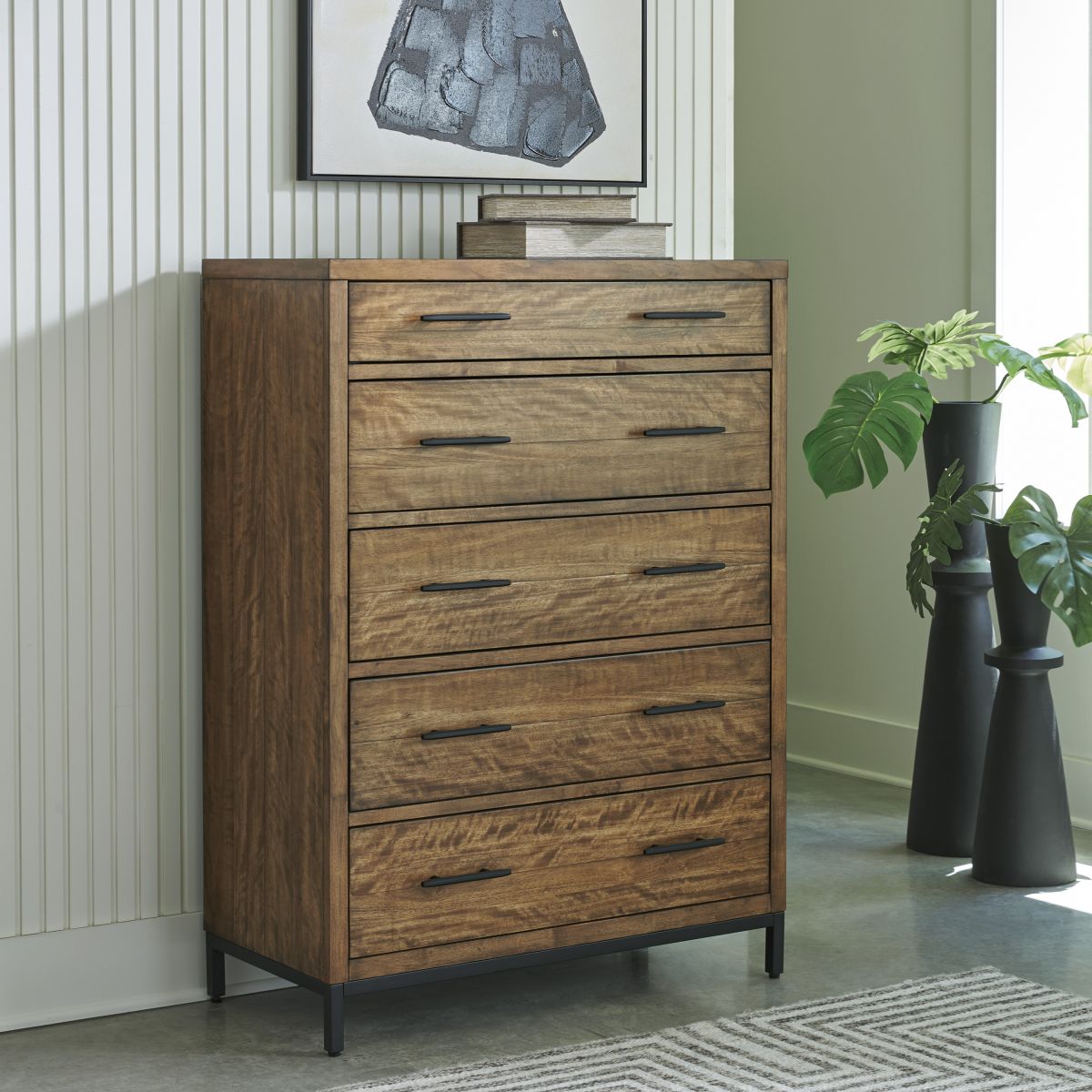 Cool, chic and crafted for the everyday, the Steenlage chest of drawers is well-suited to your urban contemporary character. It pairs the natural beauty of wood with black metal for a luxe industrial feel. And with five sturdy drawers, sleek bedroom storage is nearly effortless. How’s that for relaxed refinement?
