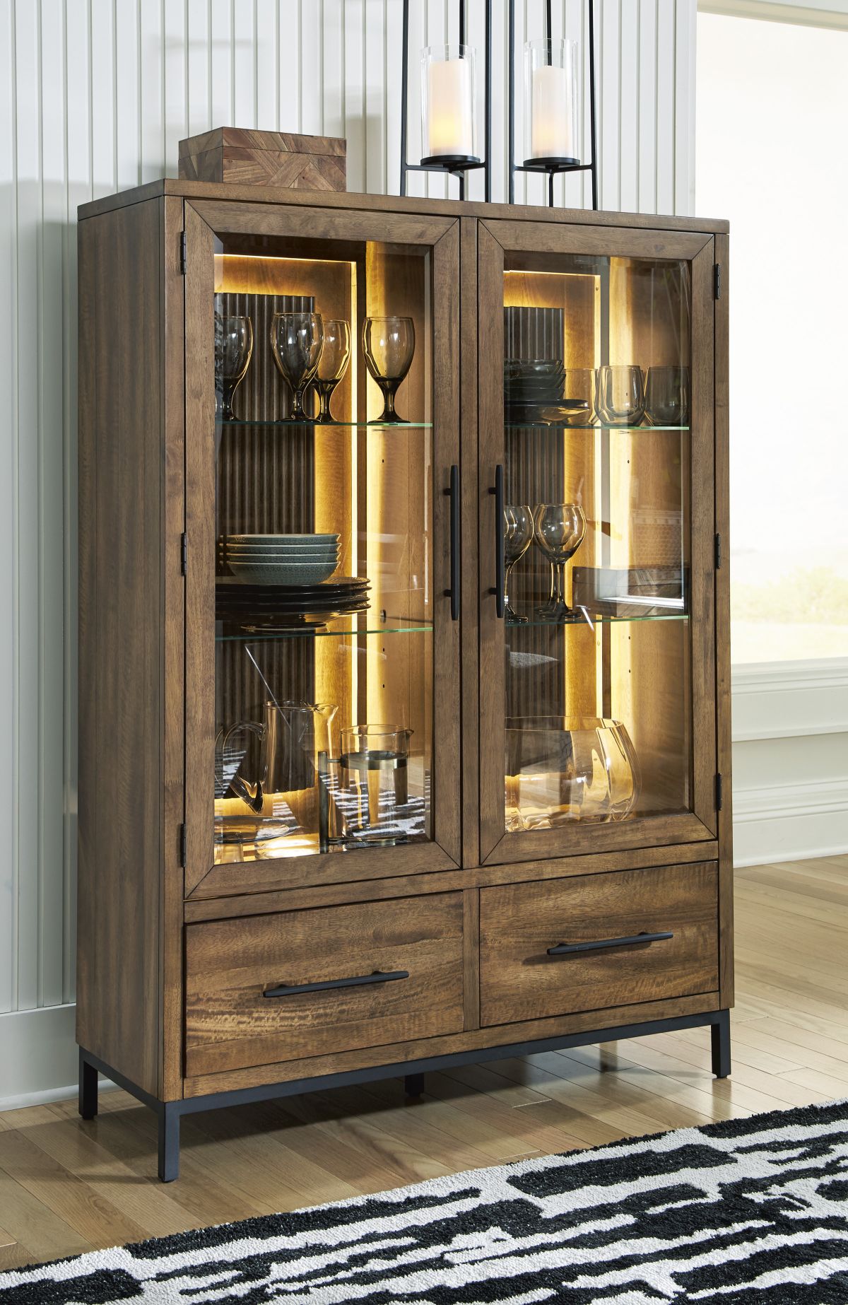 Cool, chic and crafted for the everyday, the Steenlage display cabinet is well-suited to your urban contemporary character. It pairs the natural beauty of wood with black metal for a luxe industrial feel. LED accent lighting and reeded back panels upgrade your display space, acting as a beautiful backdrop for china, collectibles or other decor. And with this cabinet's velvet-lined, soft-close drawers, sleek dining room storage is nearly effortless. How’s that for relaxed refinement?