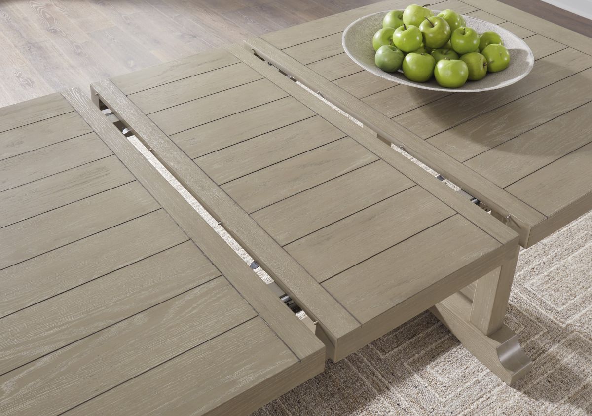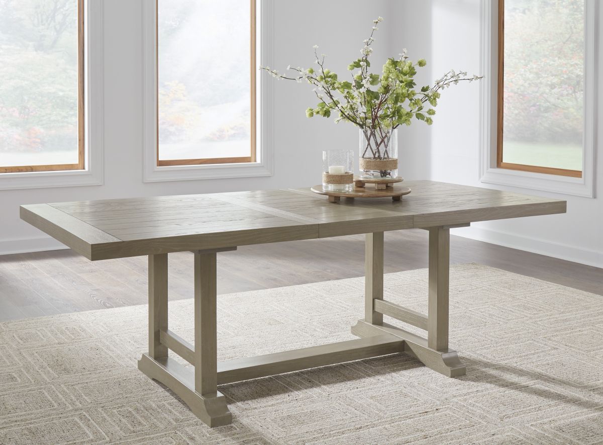 Indulge in relaxed refinement with the Vallardia extension dining table. A casual silhouette and light grayish brown finish exemplify its updated take on traditional styling. And the trestle table’s removable leaf makes room for one and all. Now there’s a show of great taste.