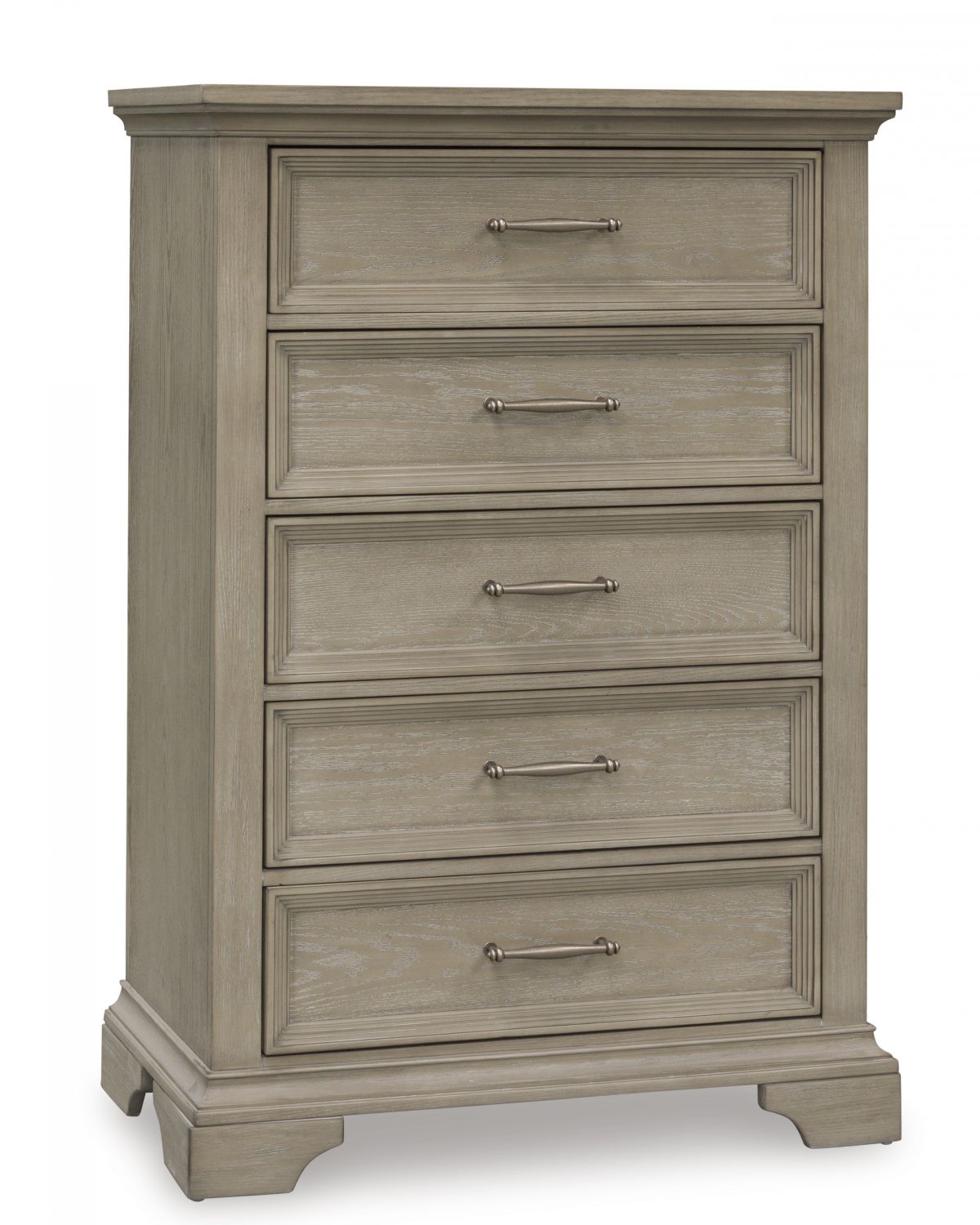 Indulge in relaxed refinement with this chest of drawers. Its art deco-inspired moulding and casual grayish brown finish exemplify an updated take on traditional styling. Spacious drawers with bronze-tone pulls offer plenty of storage for jeans, sweaters, socks—your call. Inspired by the past and reimagined for the present, this chest is ready to embrace the demands of everyday life.