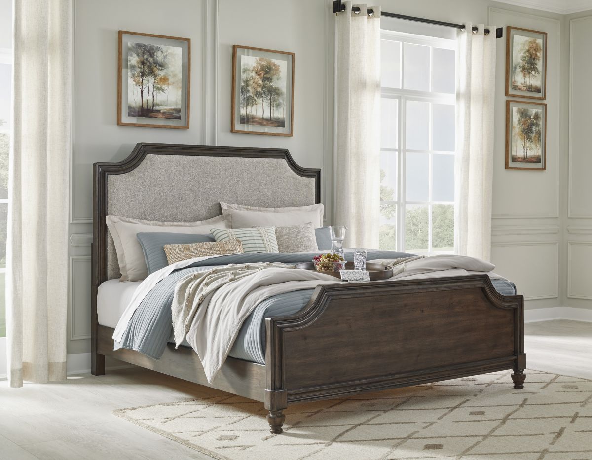 For those who appreciate a traditional aesthetic with understated elegance, this queen upholstered panel bed brings home a dreamy look. Its rich brown walnut finish merges seamlessly with the headboard's neutral textured fabric for a richly classic appeal. And did we mention the timeless, shapely bun feet?