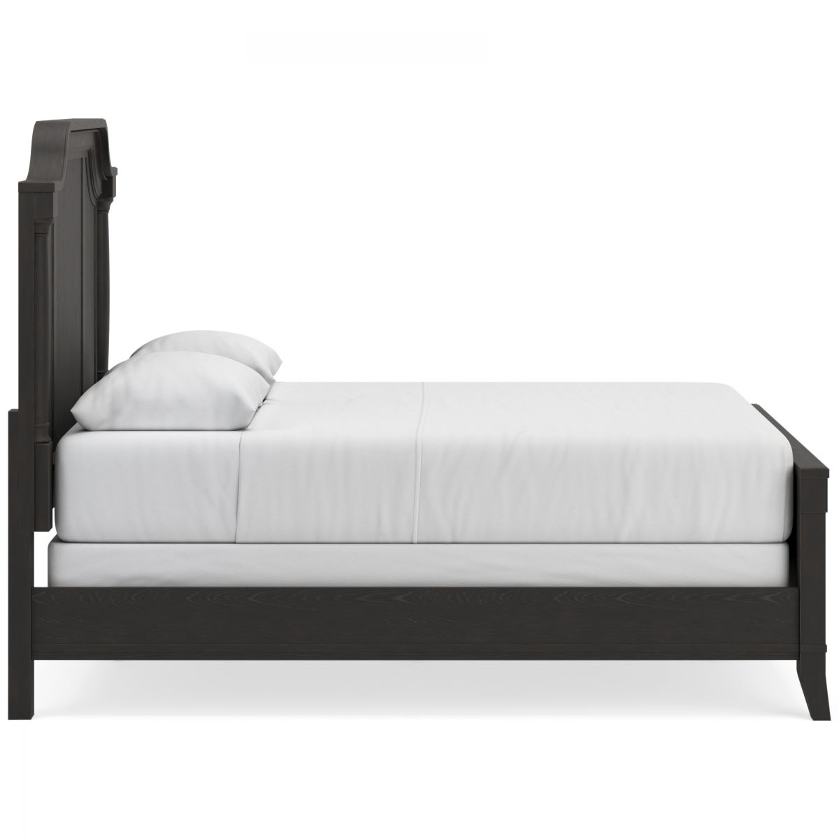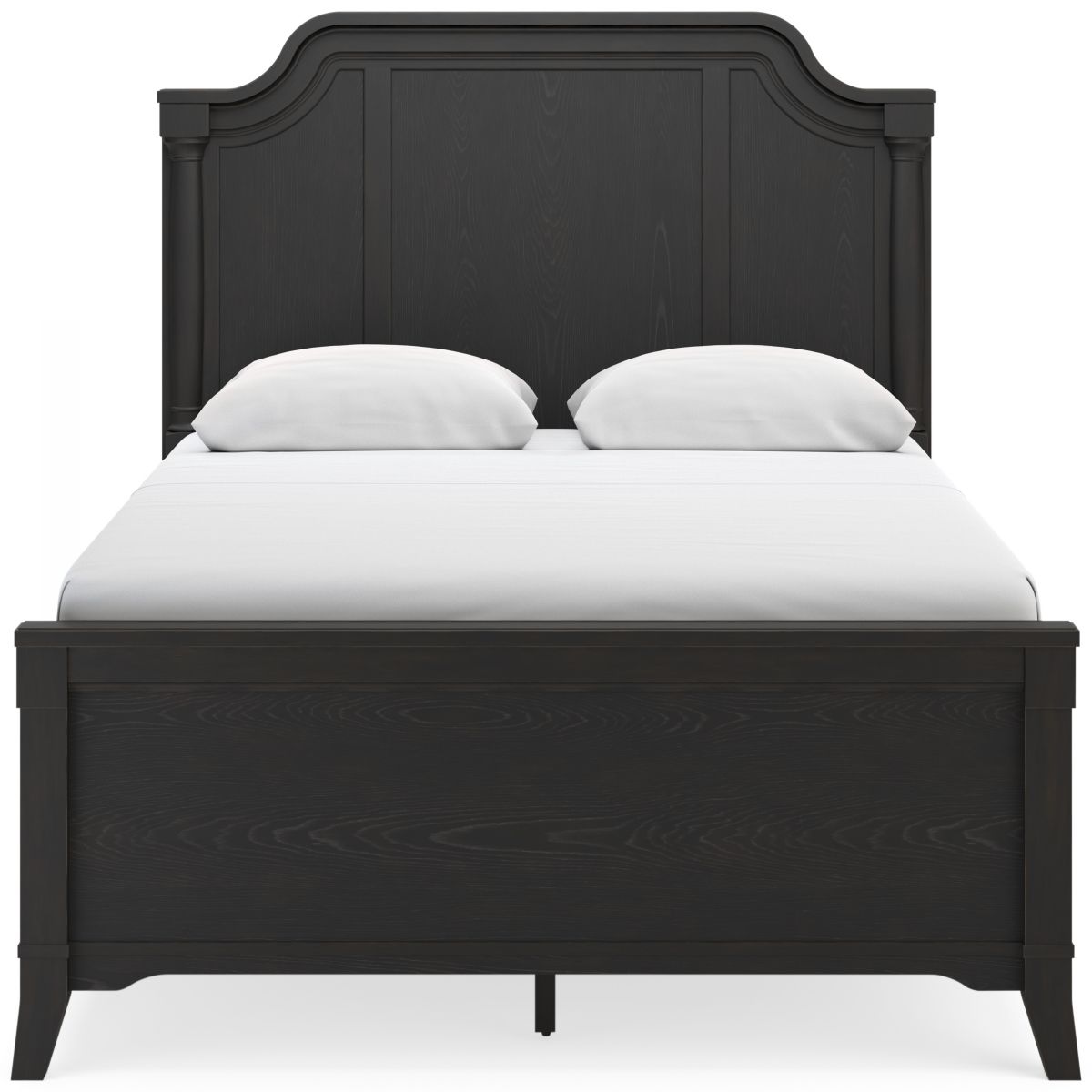 For those who love the classic profiles of traditional design—but want to forego the overly formal details—behold the Welltern queen panel bed. Saber legs, along with the framed headboard's gracefully shaped crown and stylish half round posts, add distinctive touches. A rich layered black finish on the textured wood grain surface with rubbed-through edges offers a subtle sense of gently aged charm. What a beautiful take on urban revival design.