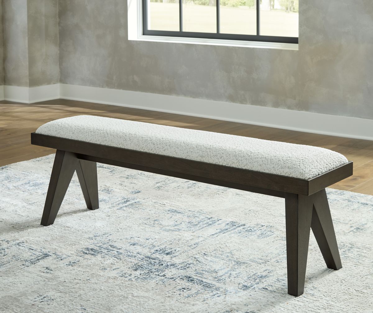 Create your ideal mealtime seating with this upholstered dining bench. Its dark espresso brown finish and clean lines are undeniably contemporary, but the attitude is more relaxed—our interpretation of metropolitan casual style. The comfortably cushioned seat is wrapped in textured polyester for subtle dimension. Whether you're starting your day or winding down, this generously scaled seating option makes room for friends and family.