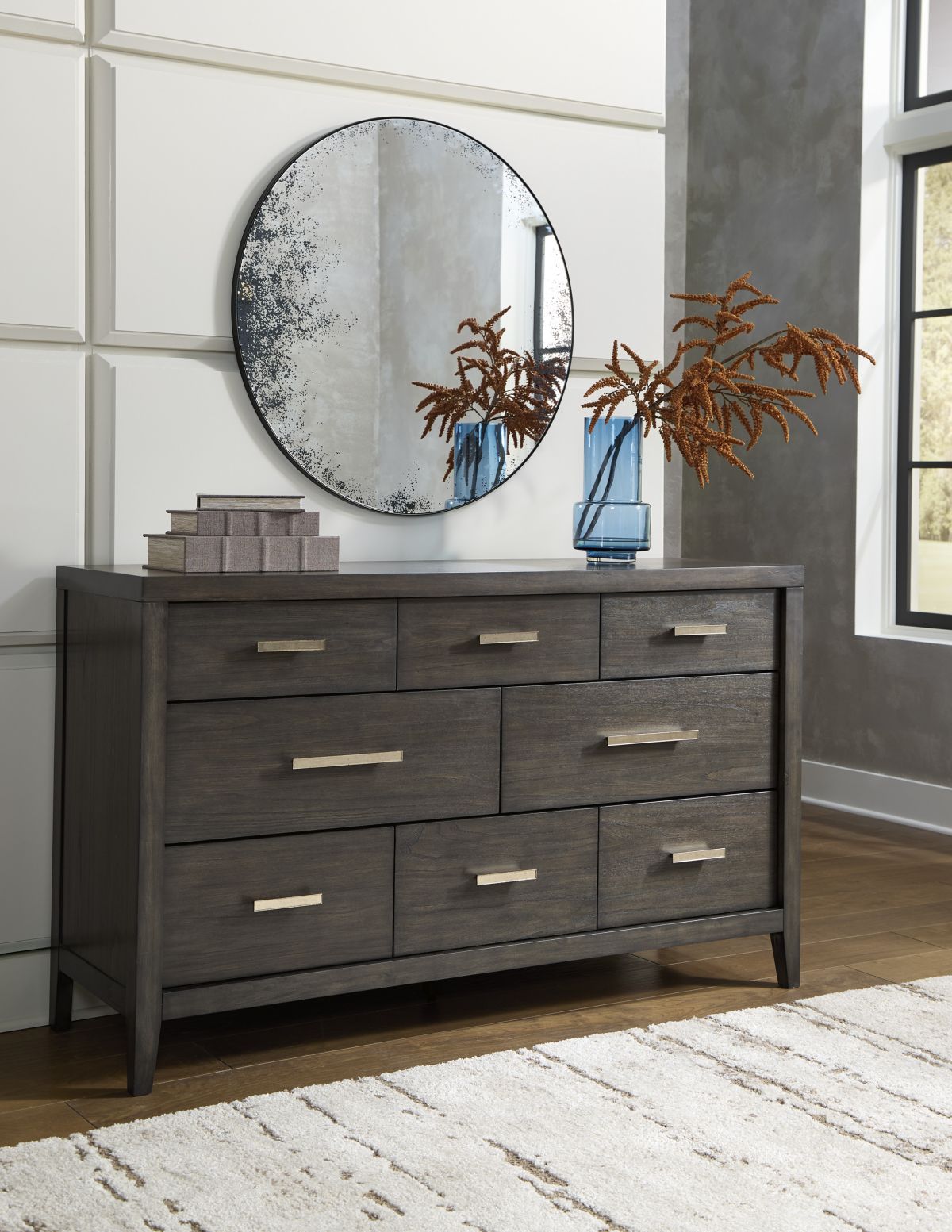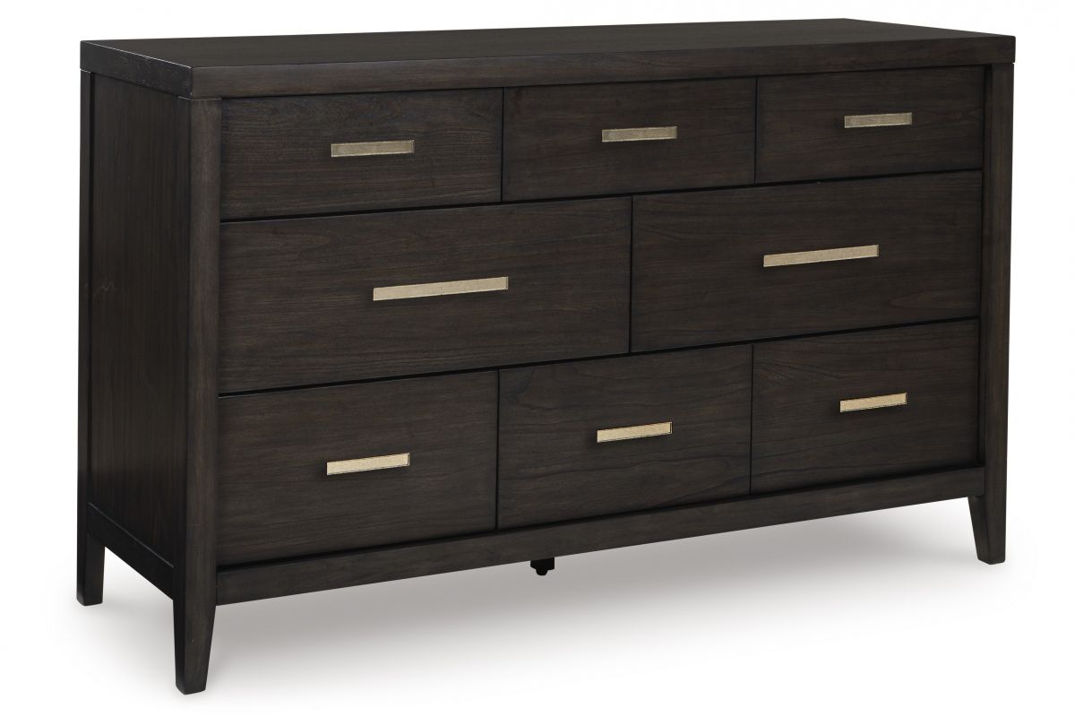 Create your ideal sanctuary with the Westonfort dresser. The dark espresso brown finish and clean lines are undeniably contemporary, but the attitude is more relaxed—our interpretation of metropolitan casual style. An off-the-floor design with tapered legs beautifully elevates the mood. Spacious drawers with ridged metal bar pulls keep essentials organized. Whether you're starting your day or winding down, this stylish piece provides the perfect backdrop.