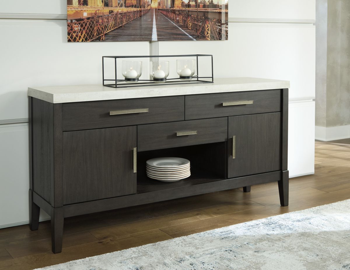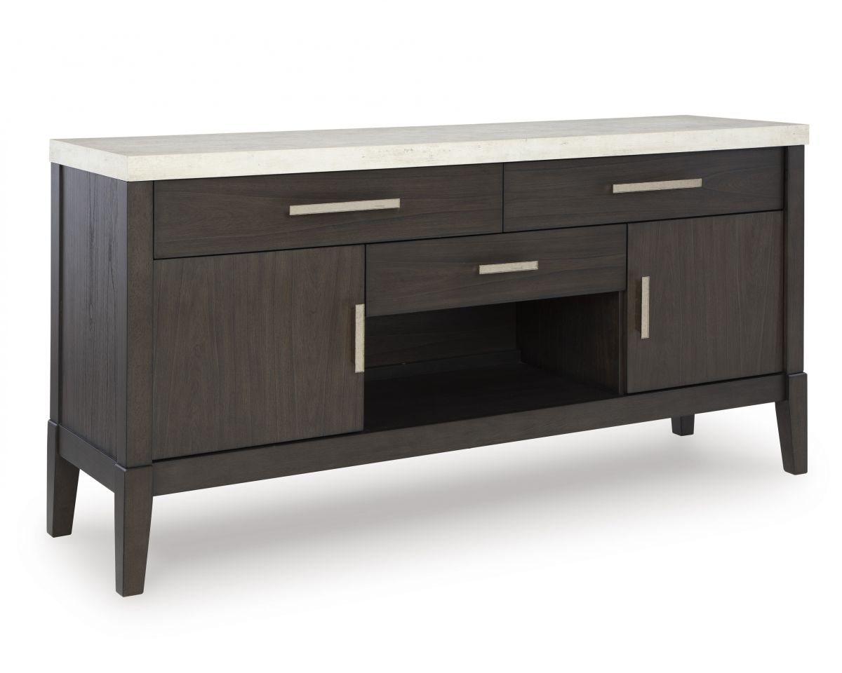 Create your ideal dining area with this server. Its dark espresso brown finish and clean lines are undeniably contemporary, but the attitude is more relaxed—our interpretation of metropolitan casual design. Cabinets, shelves and spacious drawers conveniently store dining accessories. It also effortlessly works as a sideboard, entryway table or TV stand. Wherever you place it, this perfectly stylish server is the versatile piece you've been looking for.