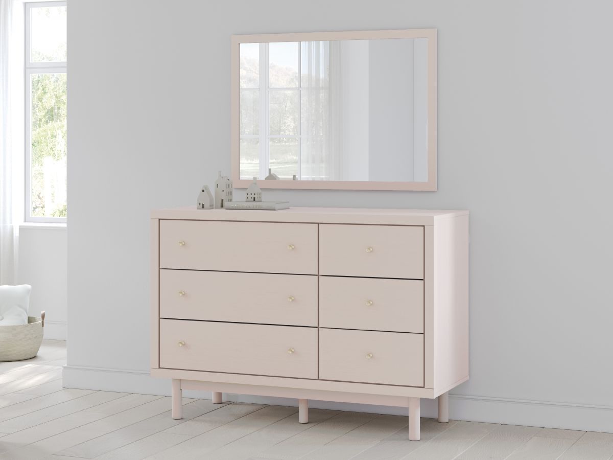 Pretty in pink. The Wistenpine dresser with mirror keeps the spirit of your home’s modern aesthetic while suiting all your young one’s needs. Its subtle blush finish brings a playful, charming vibe to organizing clothes and other essentials. Made for her and styled for you, it’s a lovely addition to a beautifully chic child’s bedroom.